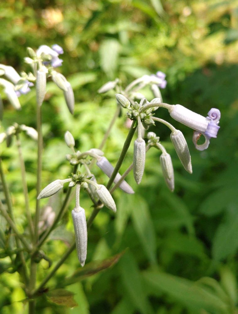 夏〜秋にかけて小さなベル形の淡藤色の花を咲かせる原種のクレマチス(ハンショウヅル)の仲間です。ボタンの葉に似た形の葉をつけることから「草牡丹」の和名がつけられました🤍💜🌿
