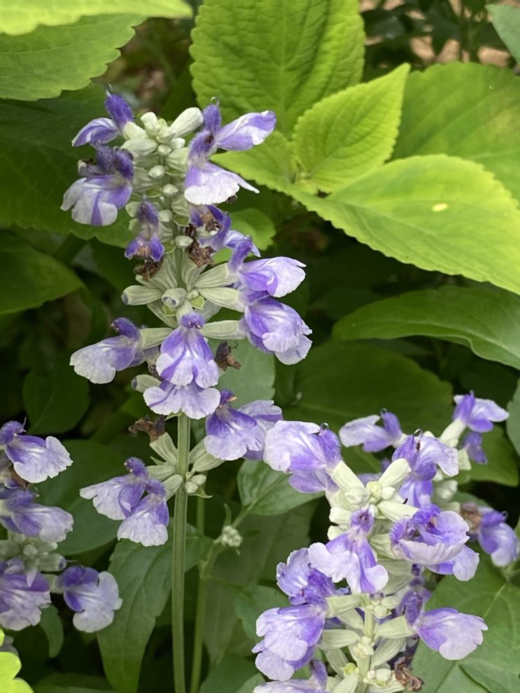 コリウスに押されながらも涼やかに咲いています✨