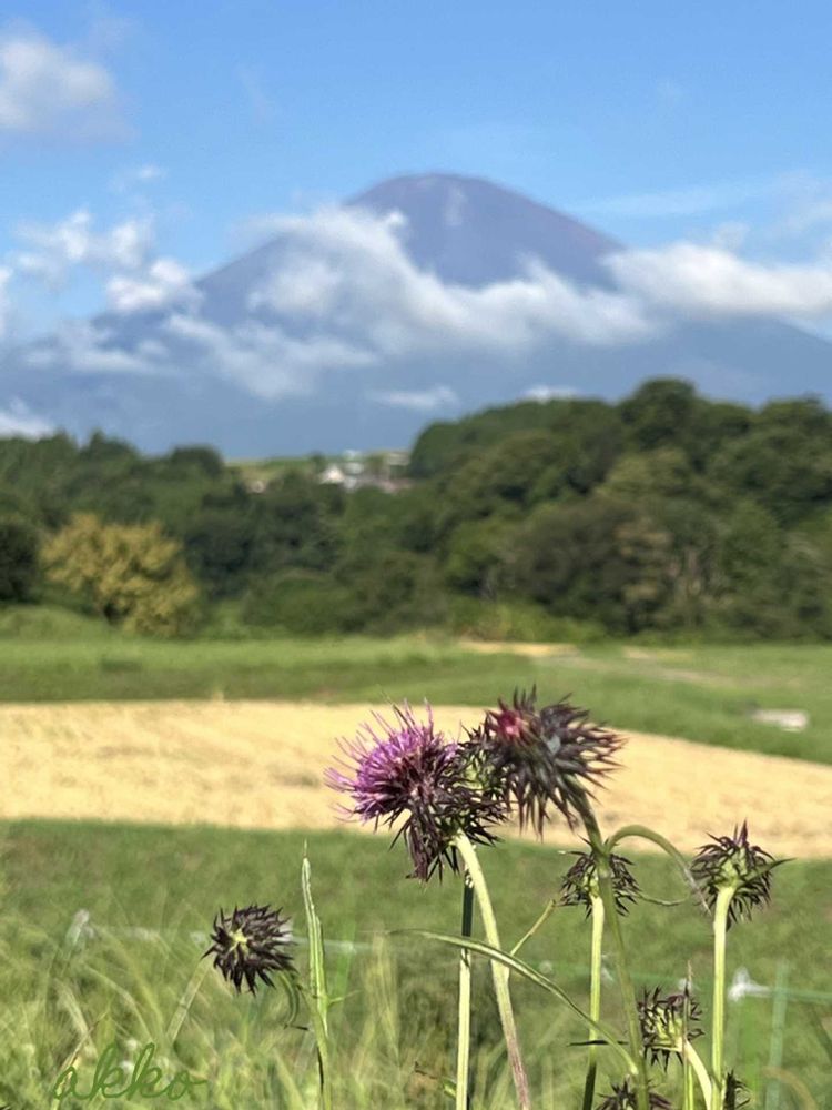 今朝の富士山と薊、赤とんぼ、稲刈り前後の田