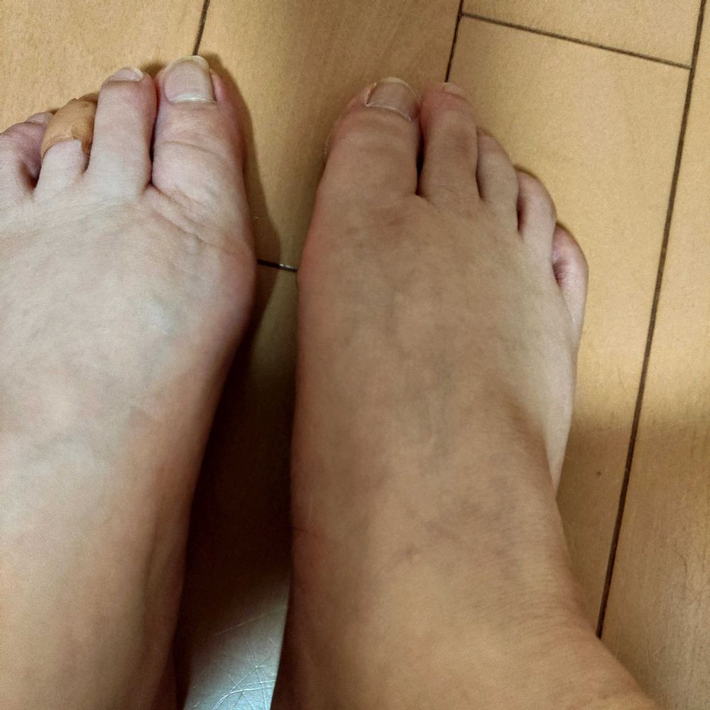三枚目は余談話…私の汚いあんよです😅→5月に心療内科で採血の検査をしてもらいました。尿酸値が7.3で、元々、事故で左下肢の神経を傷めていてしびれがあり、はて🤔傷みはあったのかな?8月に入り左足の親指付近が痛く“もしや😖尿酸値が上がり痛風か⁉️”と気になり月末に採血をしてもらってました。今日、結果を聞きに行くと7.1に。先生からも「その数値じゃ痛風の痛みじゃないね!」と。そして、昨夜、思い出したのです。事故で入院していた頃、理学療法士さんに左足は外反母趾があると。この頃から、記憶に残るような痛みを感じませんでした。
