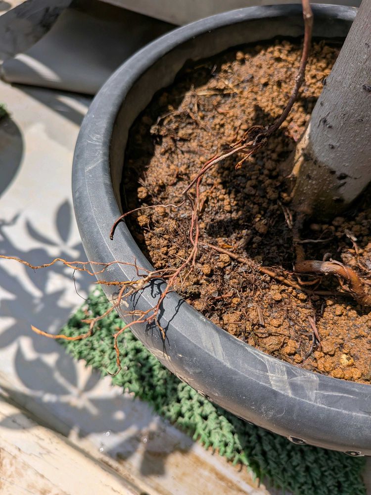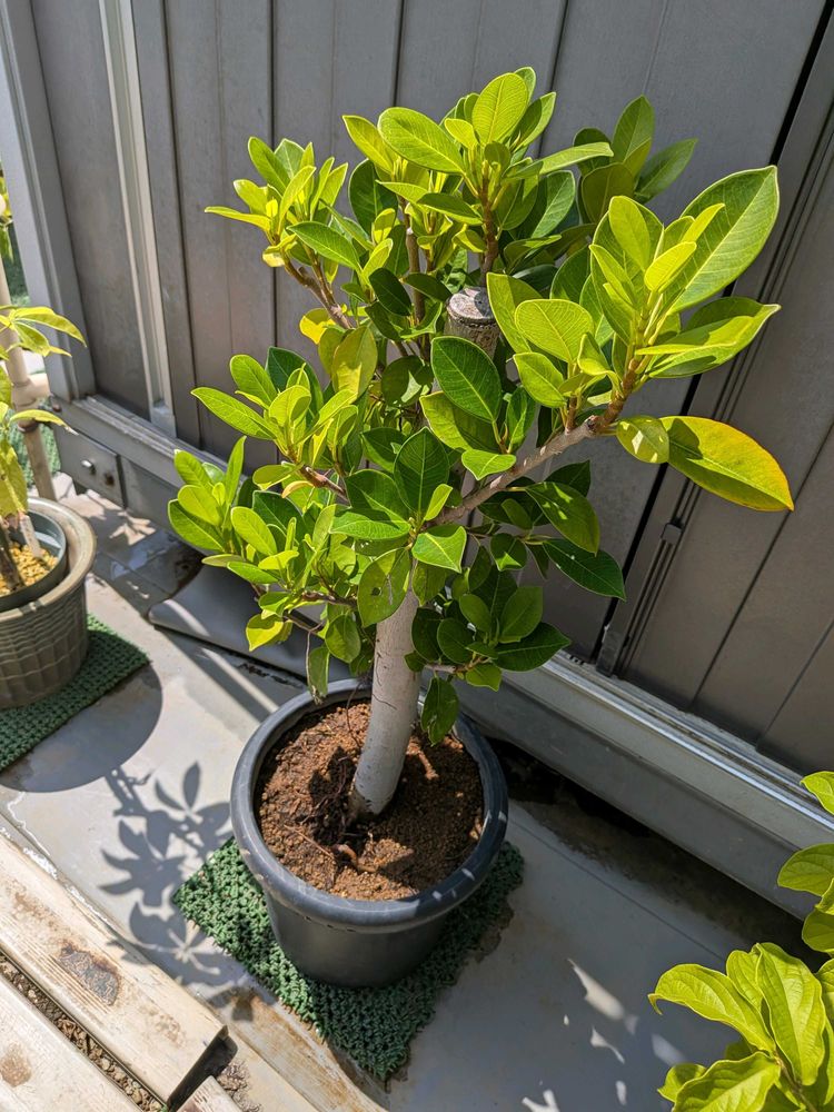 沖縄から枝を頼み挿し木して1年以上の沖縄産ガジュマルですが挿し木だと親のクローンなので気根が出にくく根が太りにくいと言われていますが湿度を高いのを好むので朝夕に葉水をしていたら気根が出て来ました。また根を太くする方法もあるので来年にでも試して見たいです。ちなみに園芸店に販売されている物は東南アジア産でにんじんガジュマルと言われ種から撒いて畑に植えて人工的に根を太らせた物で沖縄に昔からあるガジュマルではありません。なぜなら発芽率が非常に悪く繊細なので業者も嫌がるからです。そして沖縄県名護市にある有名なひんぷんガジュマルが樹齢300年以上、樹高19m、幹周り10mもある名護市のシンボルでもあります。