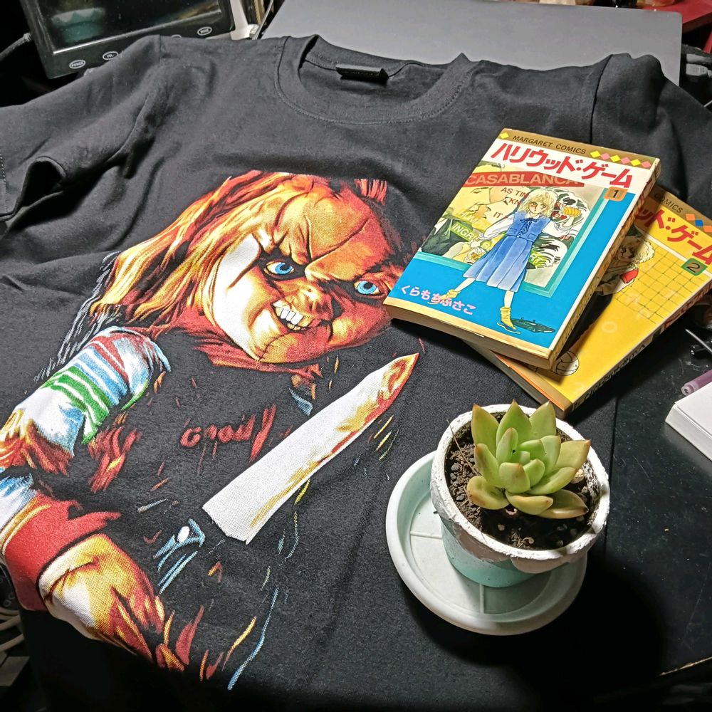 このテーシャツさ、折り畳んであったからチャッキーの顔しか見ないで買ったんだけど、、、