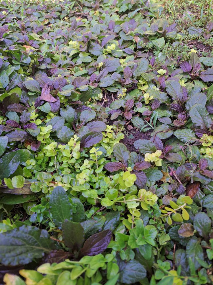 アジュガは、ランナーを伸ばしてどんどん増えます リシマキア・オーレアはアジュガの勢いに押されつつも少しずつ広がっています