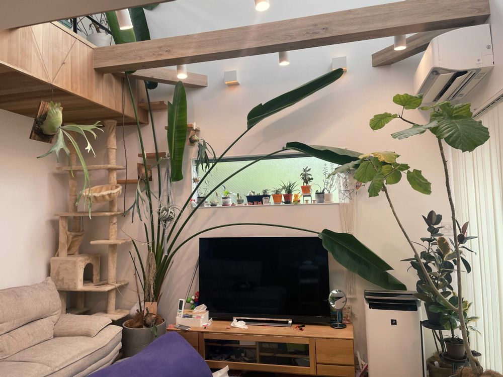 もっと梁とかに吊るしまくって植物モリモリにしたいけど水やり管理を考えると悩ましく…🤔