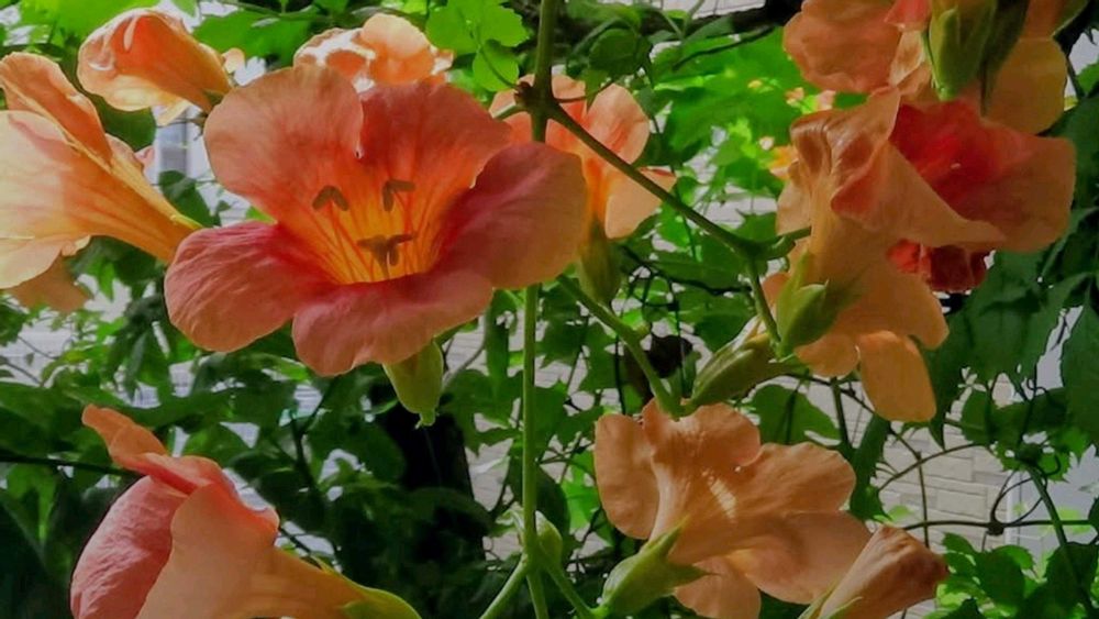 オレンジ色のラッパ状の花で、**ノウゼンカズラ(凌霄花)**という植物の花に見えます。
