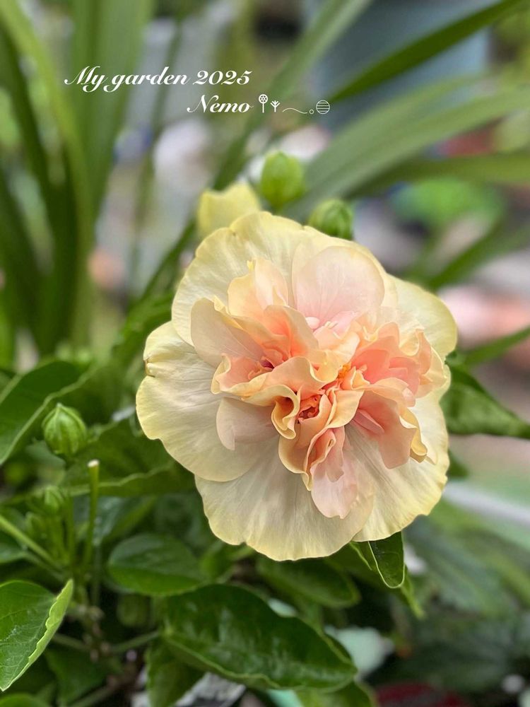 沢山蕾みが付いたのにポロポロ取れてようやく咲いたダブルのハイビスカス、名札にアドニスダブルホワイトとなってたけど咲いたのはちょっとオレンジぽい色、白い色を楽しみにしてたのですがこれも良いですね💕