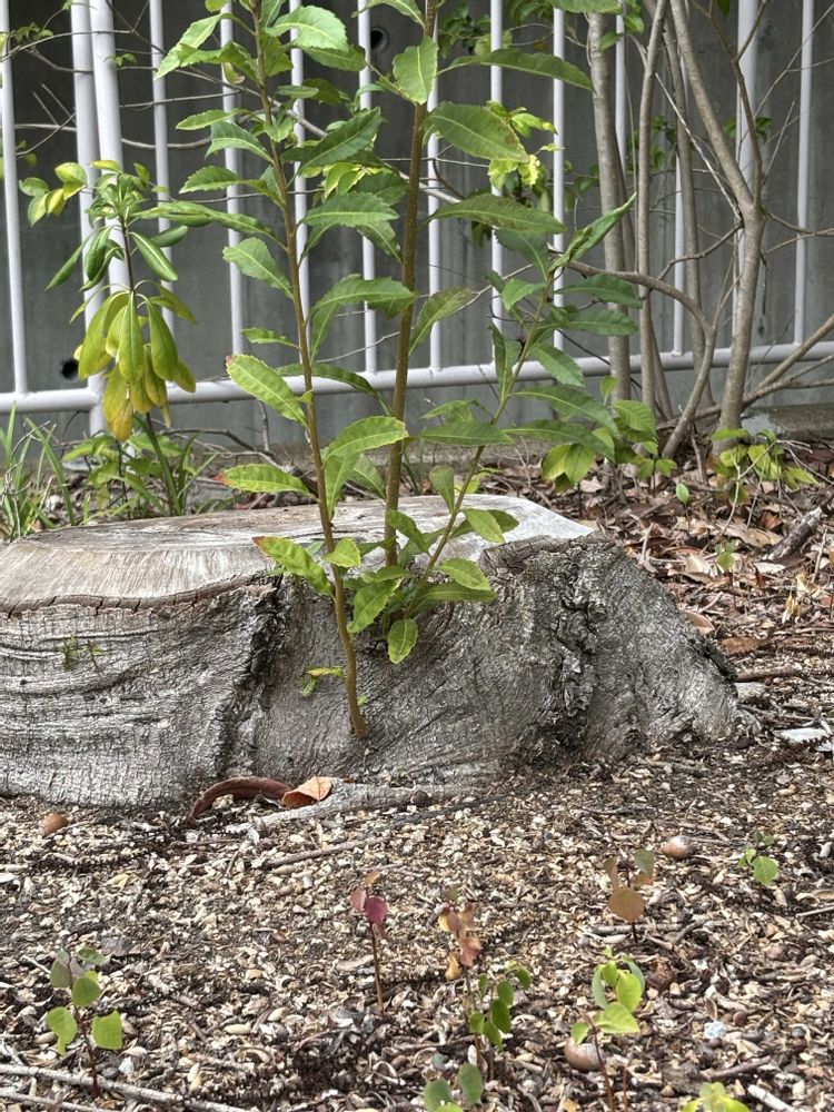 この画像は、切り株から新しい芽が伸びている様子を捉えたものです。これは「ひこばえ」と呼ばれる現象で、樹木が伐採された後も、切り株の根元や幹から新しい芽が出て成長することがあります。これは樹木の生命力や再生能力を示すものです。