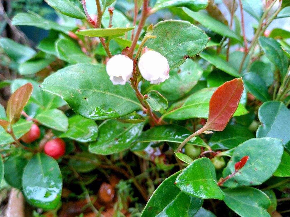 チェッカーベリーの実が赤くなってきたのに花がまた咲きました🤍
