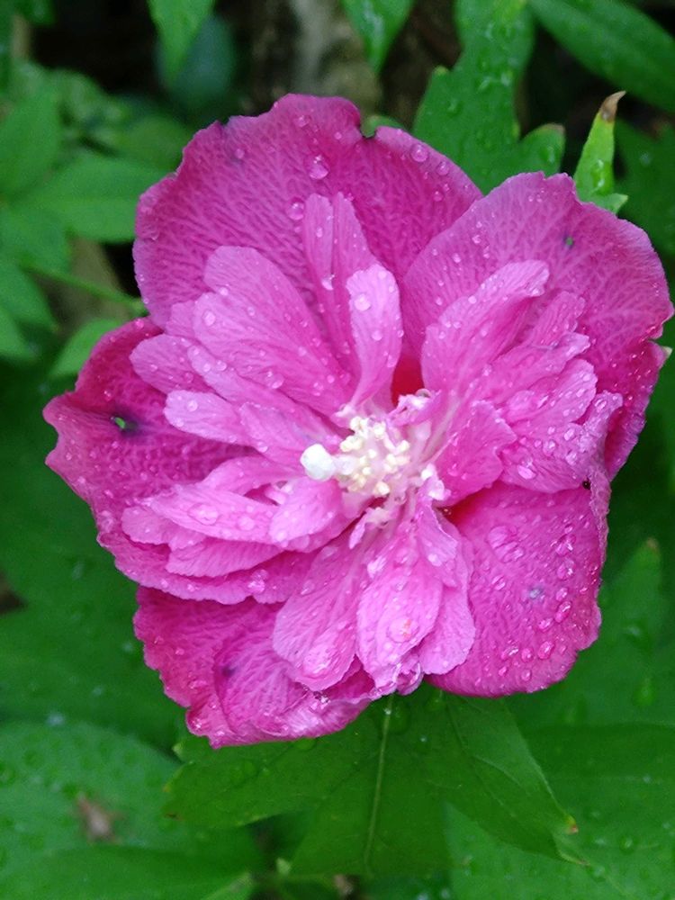 バス停横に八重のムクゲ🩷が雨に濡れていました