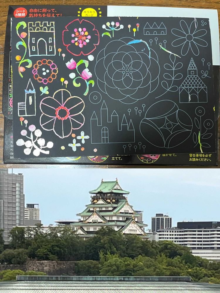 ①ホテルのお花と、②9キュッとフェス2025に参加します。孫👧が来てやりかけのスクラッチアートと大阪城🏯です。