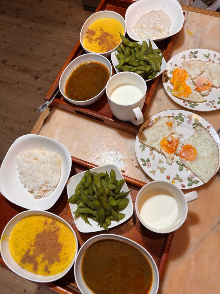 目玉焼き、,枝豆、冷凍,白米お焦げご飯の投稿画像