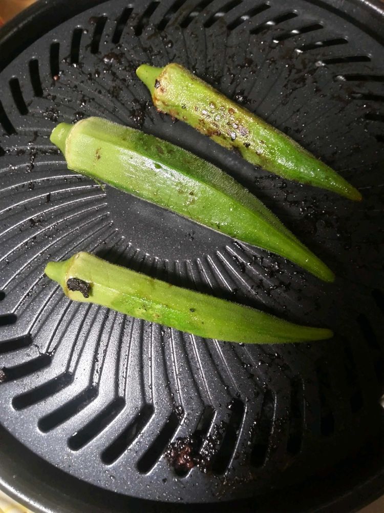 オクラ毎日、収穫して冷蔵庫に溜まる一方だから焼き肉したついでに焼いて見たら