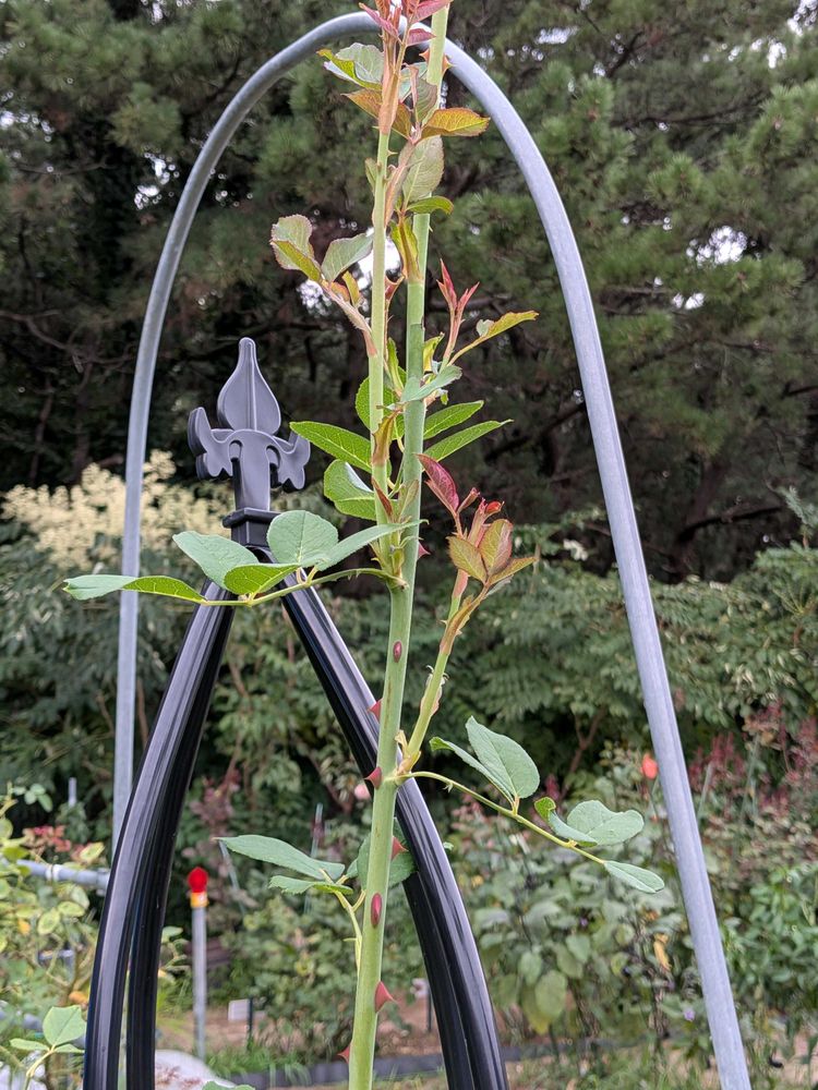 あまりに立派なのでピンチをしたら新芽が3つになって出てきました✨👍ピンチ前より太くなりオベリスクの支柱と同じくらいの太さ😅栄誉一極集中してるよね…💦