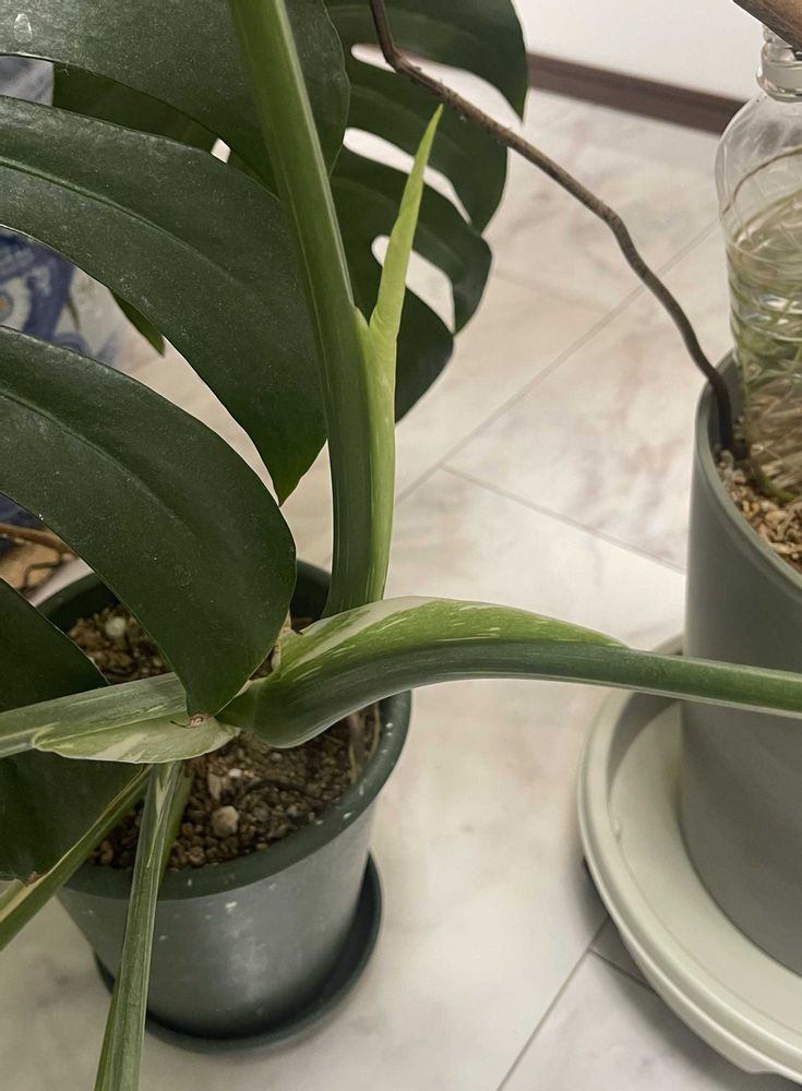 斑入りモンステラのドリルが出始めました。開くまで時間がかかりそうですね。