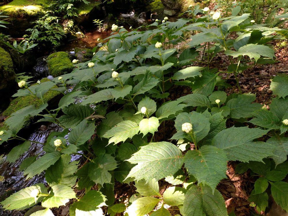 珍しいアジサイであり、大きな丸いつぼみが開くと、くす玉がはじける様に両性花と装飾花が現れるユニークなアジサイの仲間です。つぼみから花が終わるまでの移り変わりも楽しめます。