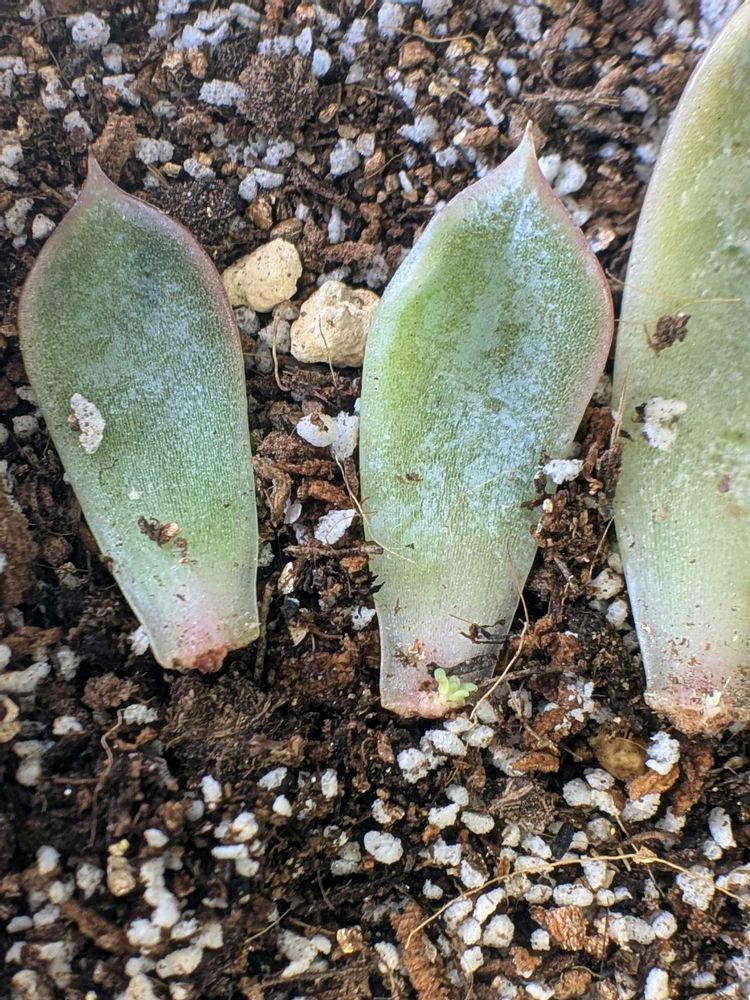 ②丁度一年前、初めてのオクサレ様降臨。何も知らないのでジュレた葉っぱも全部葉挿し🤣奇跡的に腐らなかった3枚から発芽したころ。