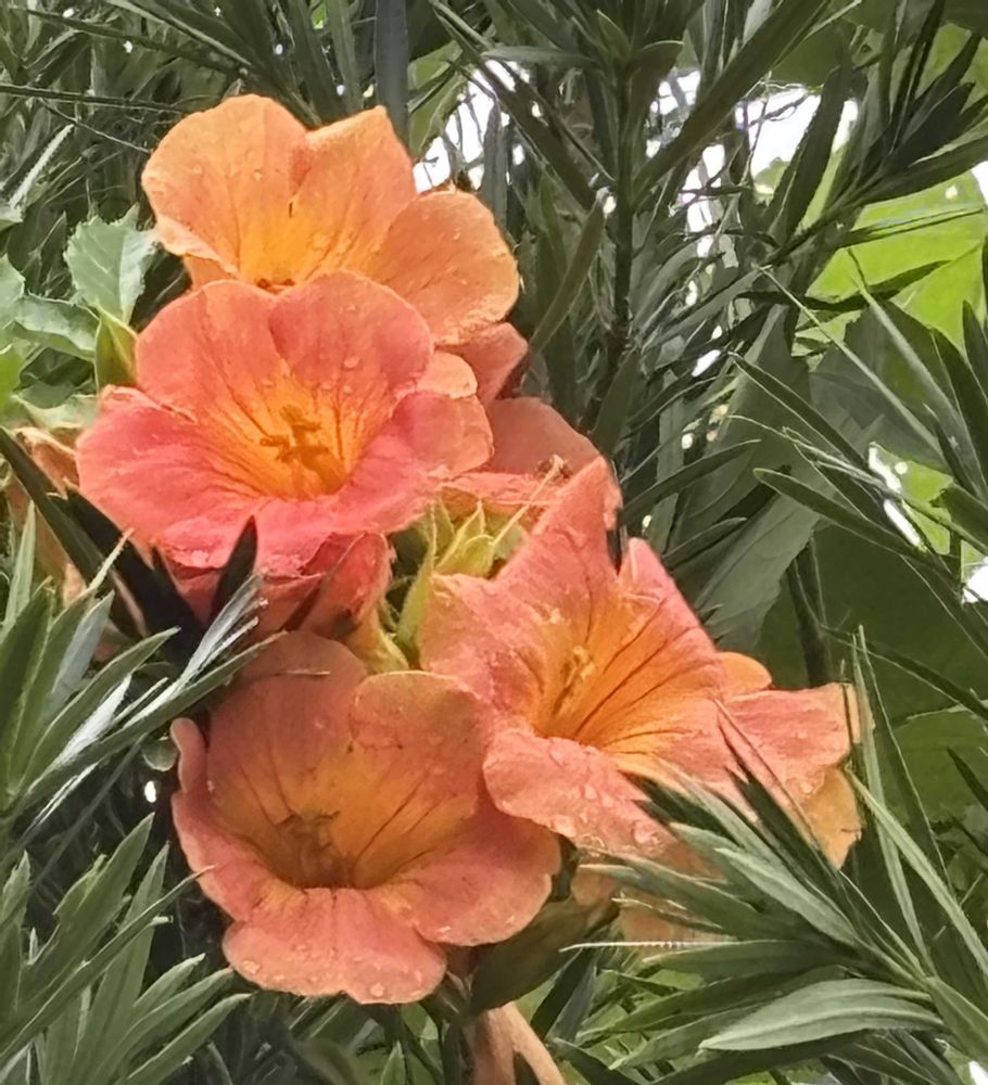 イヌマキに埋もれながら、また咲いてくれました。☀️🧡🧡🧡🧡🧡🧡🧡同僚だった人のお母様から頂いたノウゼンカズラ。咲くまで何年もかかりました╰(*´︶`*)╯♡