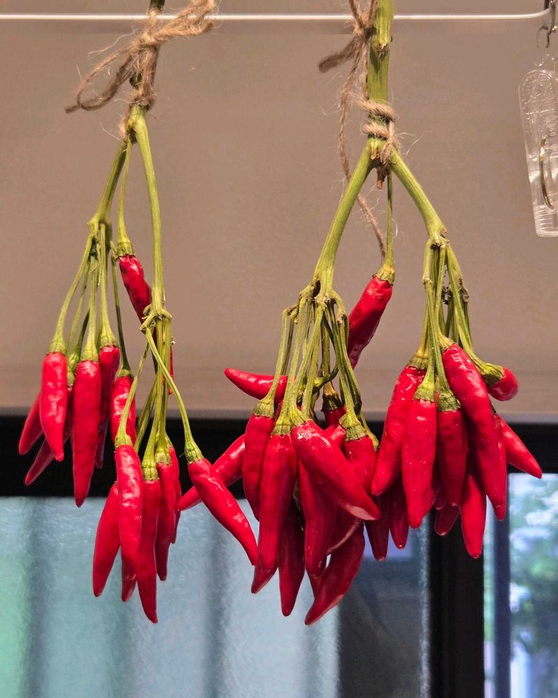 生のトウガラシだったので、買って来てから吊るして乾燥させているの。