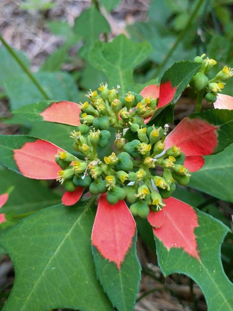 トウダイグサ科トウダイグサ属の一年草。北アメリカ南部原産で世界の熱帯から亜熱帯に広く帰化している。沖縄や小笠原では日本に返還されるずっと以前から野生化していて、かなり古い時代に帰化したものと考えられている。最近では本州でも栽培品が逃げ出したと考えられるものが道端などで見られる。全体平滑、傷つけると白色の乳液を出す。茎は直立してまばらに分岐し、高さ1mほどになる。葉は先が尖った長卵形、通常は不規則にくびれて瓢箪形となり、短い柄で互生する。花期はほぼ一年中。茎の上部に葉が集まって苞状となり、その中心に、雌雄異花の花からなる杯状花序を固めてつける。花の周囲の苞や葉は、花期に全部または部分的に赤〜淡紅色になり、この状態で切り花などにして観賞用に用いる。
