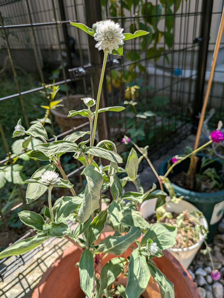 春にGreenSnapマルシェで作ったタネだんごを植えた卵の殻鉢から開花したのは…8月16日投稿の花💗に続いてまたセンニチコウの白花でした🤍😊