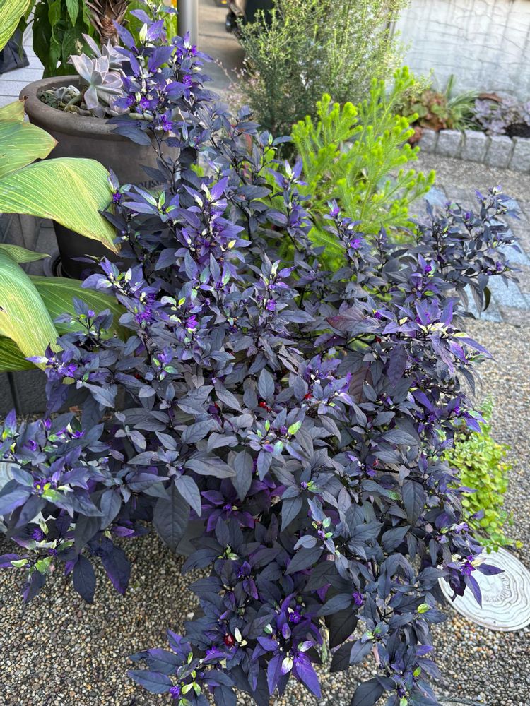 一枚目📷の、唐辛子のブラック(?)リーフに、釘付け。素敵なお庭ですね。