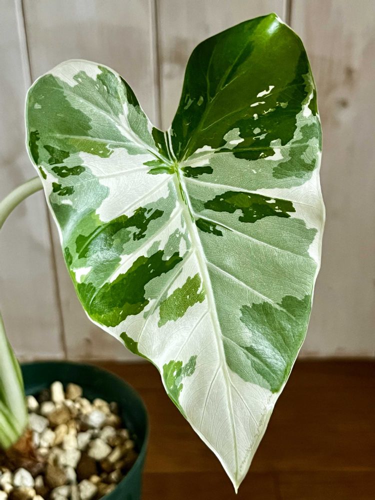 2025.8月に某サイトで購入した【アロカシア チャイ】の 突然変異?なんだろう 購入時、元々有った葉を(1枚目の葉)として、 下から新たな葉が出てきてる状態で到着しました(2枚目の葉) こちらに来て初めて出てきた葉に異変が。。 育て始めて出てきた初めての3枚目、4枚目 (途中から、斑1、斑2、、と続きます) どこまでこの謎の斑入葉が続くのか、 いや止まるのか……記録していきます