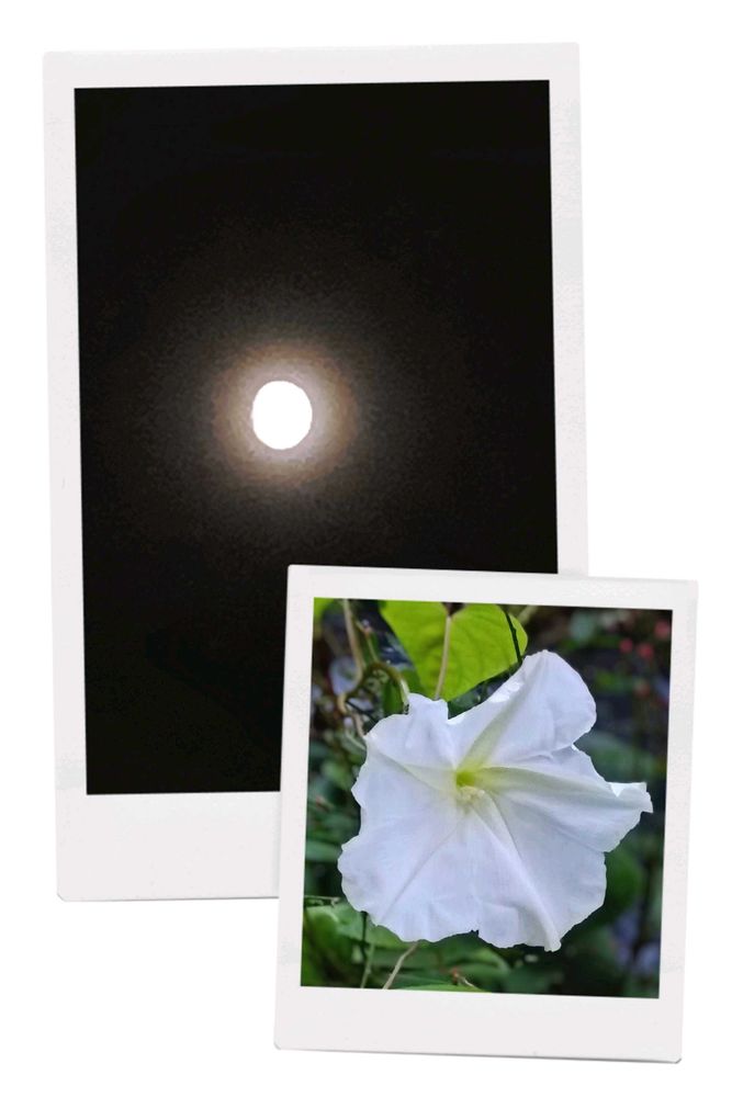雨にも負けずの夕顔とだいぶ満ちてきた朧月🌔