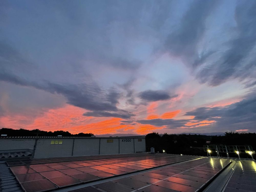 足元は太陽光発電のパネルがびっしり敷かれたわが職場の第一工場の屋根から西南西方向を向いた写真です😊