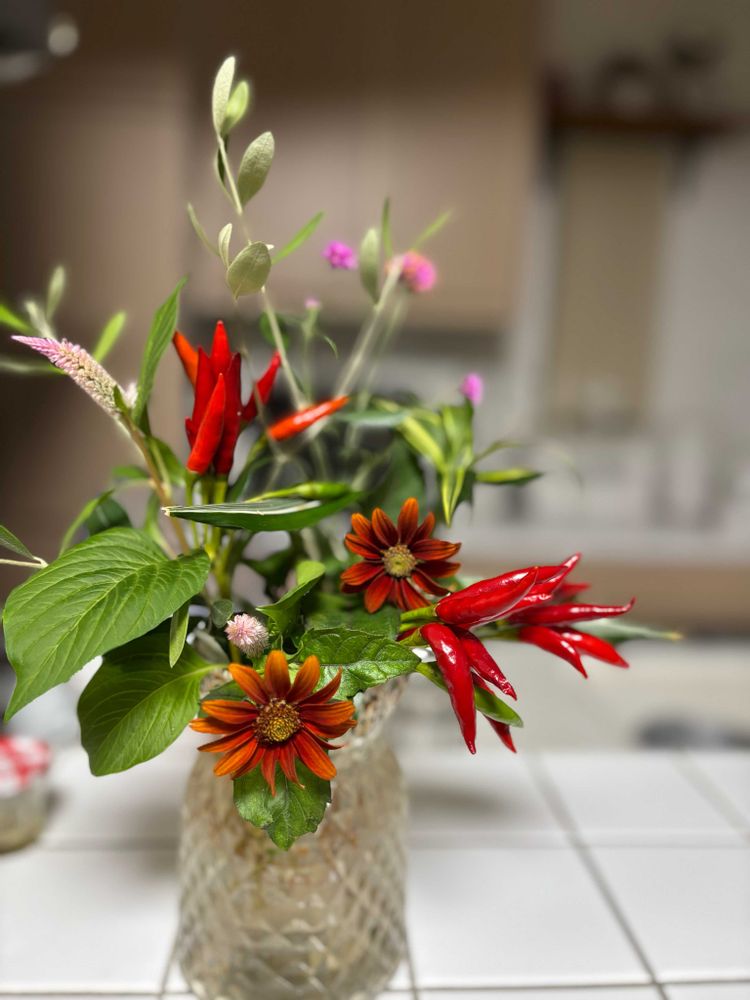 1️⃣今日のお花がトウガラシだったので先日貰ったトウガラシと庭のお花を生けていたので丁度良かった🥰