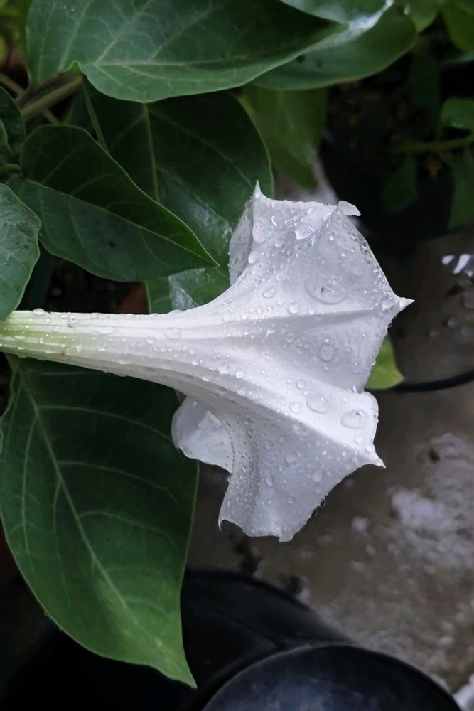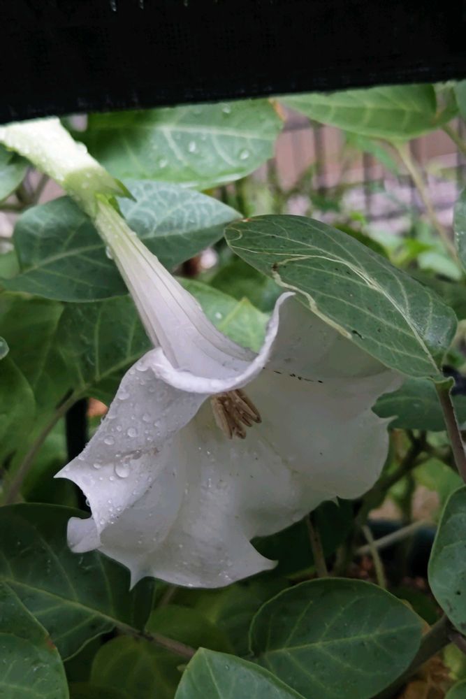 雨粒をまとった朝鮮朝顔、お散歩ちゃんを腰掛けさせました😊