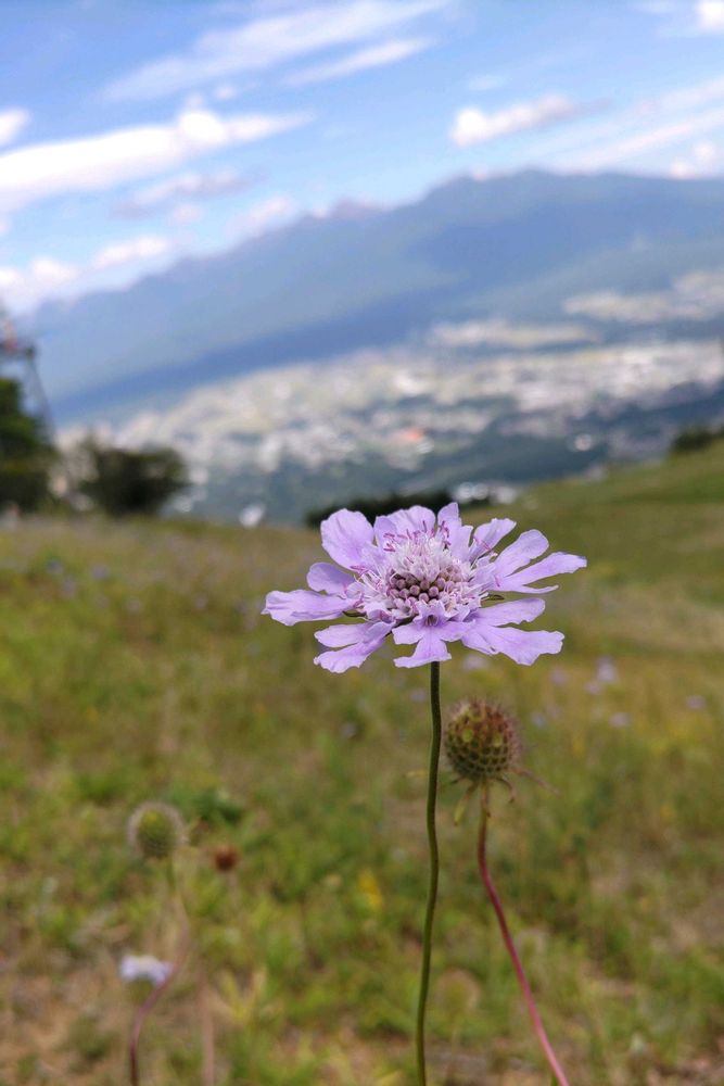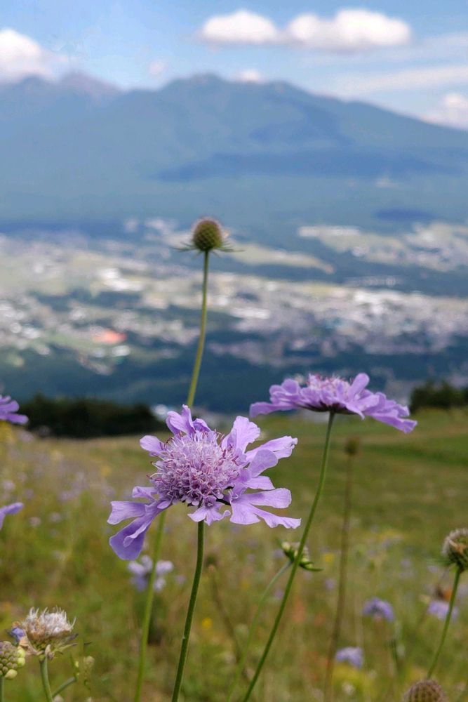 マツムシソウと八ヶ岳、冬はスキー場のゲレンデになるここからの眺めは最高です💜▲▲🎶