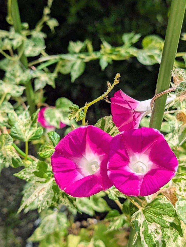 葉っぱ🌿の斑入りは 涼を感じて花をより引き立てて いる😀素敵🩷🤍✳️ 小ぶりな形⁉️ 枝垂れ咲きの姿は 愛らしいです🥰来年は 探して🌱植えて見ようかなぁ〜٩( ᐛ )و