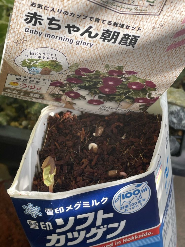 赤ちゃん朝顔って初めて知ったよ^_^牛乳パックへ種を蒔くのアイデアだね!