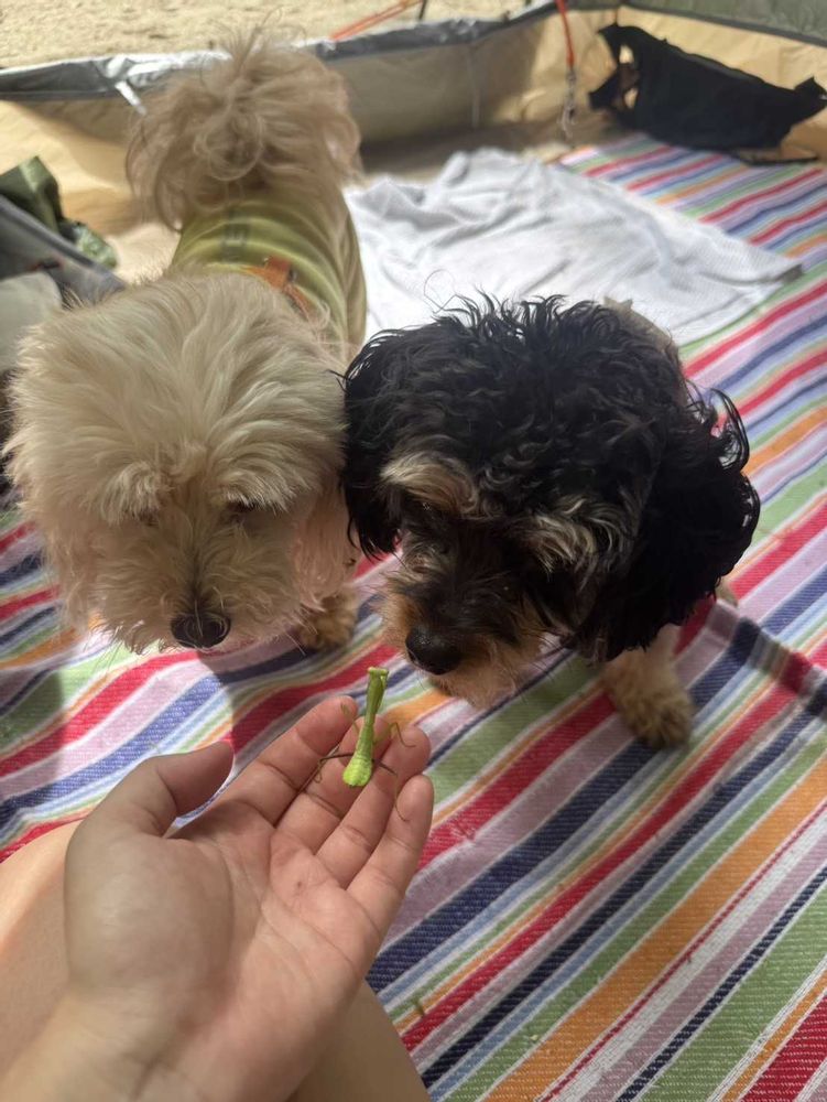 カマキリに興味津々のチコ🐶モカ🐶です。