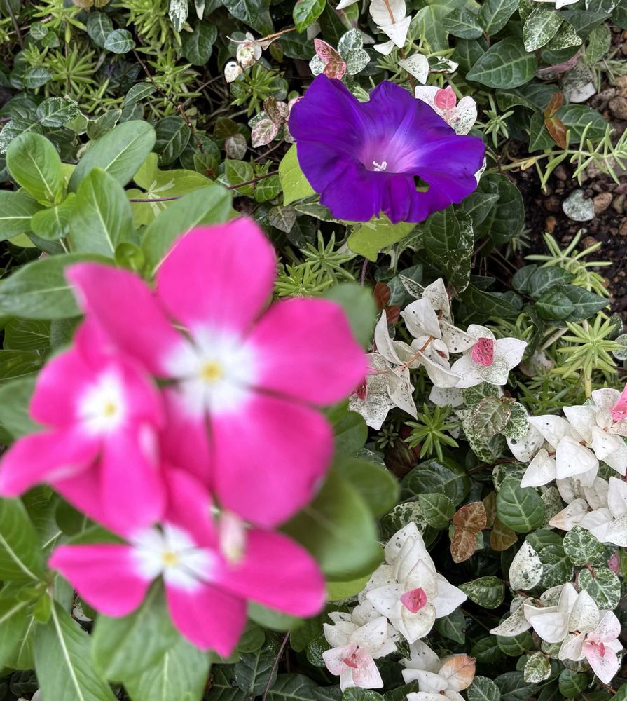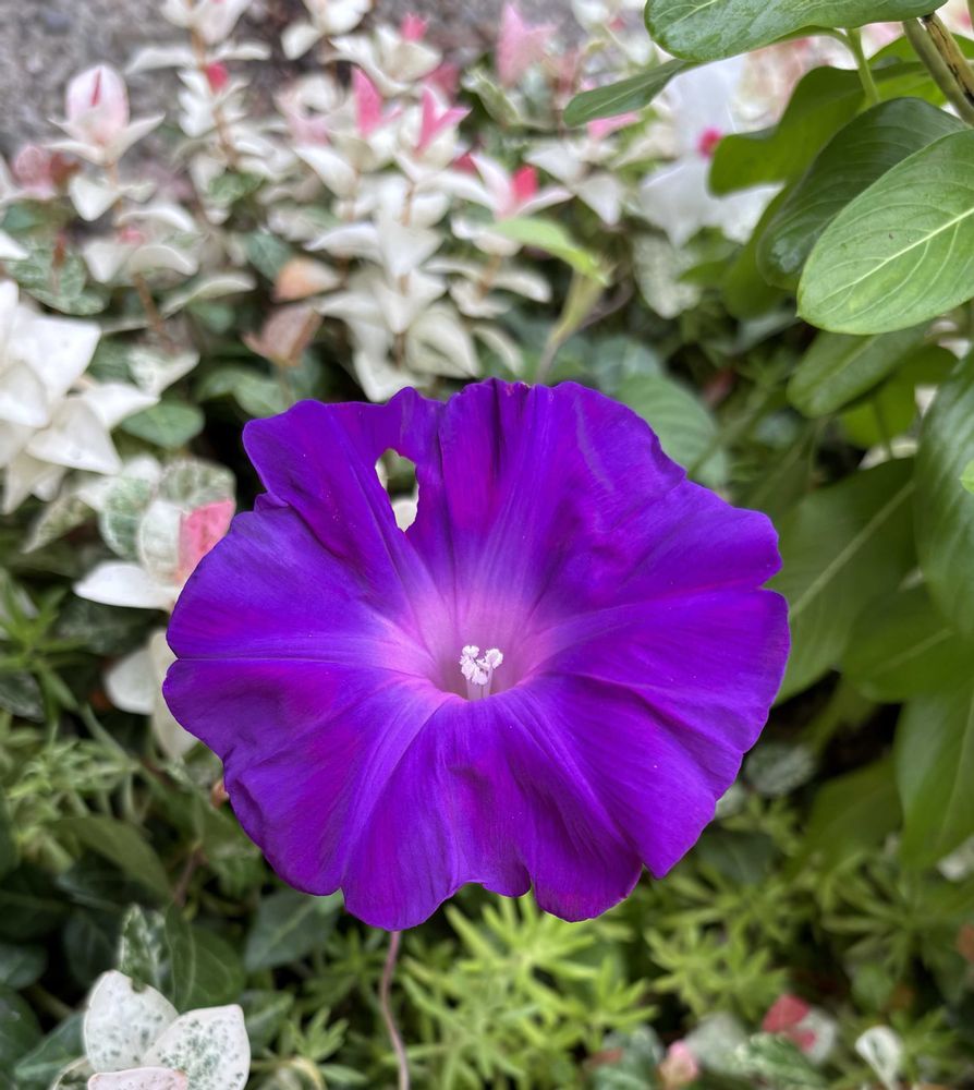我が家初紫の君🟣╰(*´︶`*)╯♡玄関アプローチ。ダメ元で植えた昨年のタネからの朝顔さん。初雪カズラと一緒に這っています。