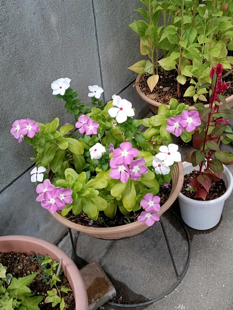 ニチニチソウのお花、白とピンク可愛いく咲いています✨️🤍🩷🤍🩷🤍💞