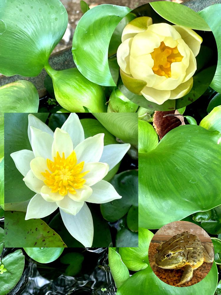 寺院の境内の大きな水鉢にヒツジグサとホテイアオイが共存していました