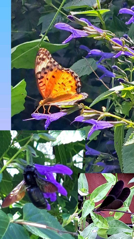③枚目…地植えゾーンの「サルビアガラニチカ」💙にも、ツマグロヒョウモンとクマバチ🐝さんが😋🎶