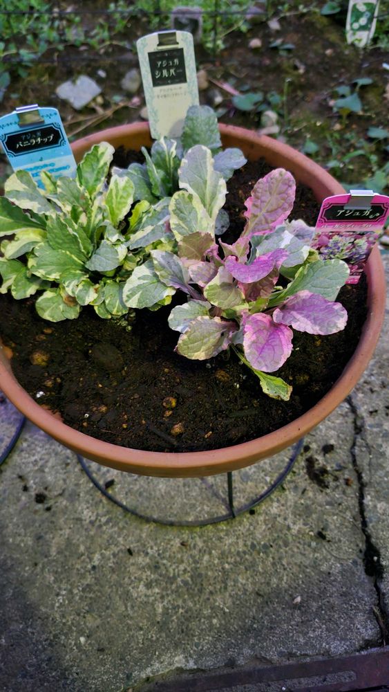 本当は今日、近所のお花屋さんにミニバラのグリーンアイスを買いにいったのですが、入荷したてのアジュガがあってもう5年育ててないなあと苗を見ながら考えてて葉っぱの色合いに負けてお迎えしちゃいました(笑)
