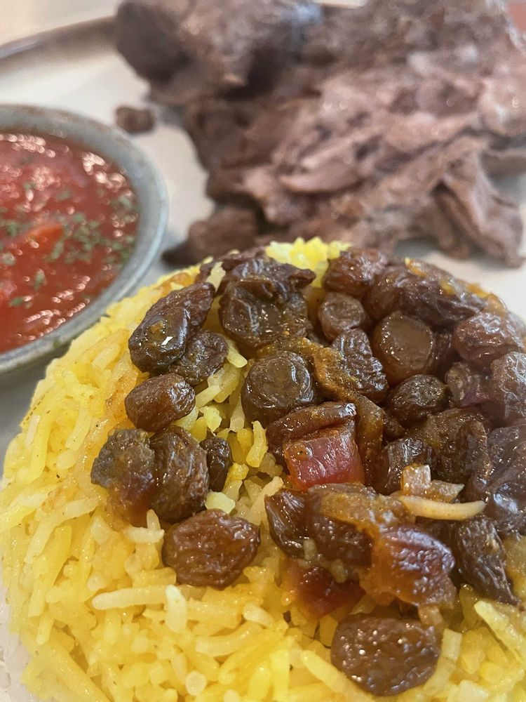 一緒についてくるごはんはサフランライスで、レーズンがトッピングされています