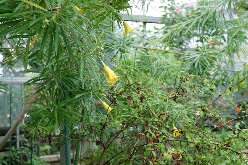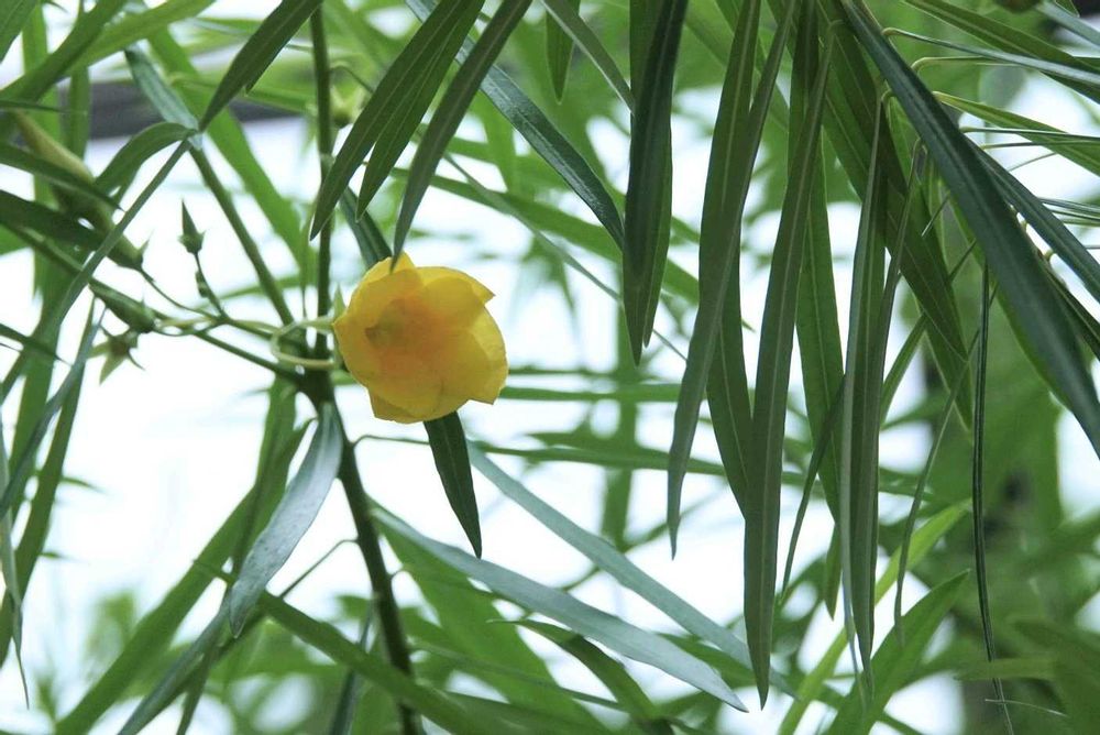 名前の通り黄花の夾竹桃ですが、近くの工業団地で見る黄花夾竹桃とは少し葉も花も違いがあるように見えました。葉も良く見る夾竹桃よりもっと細く涼やか、花も見た限り開き切った物は見当たりませんでした。