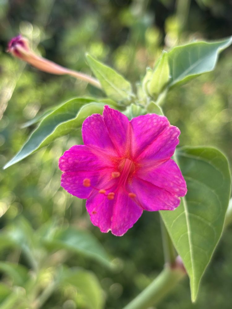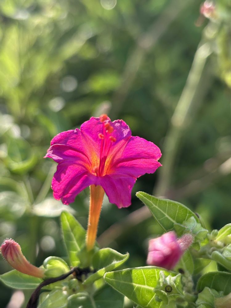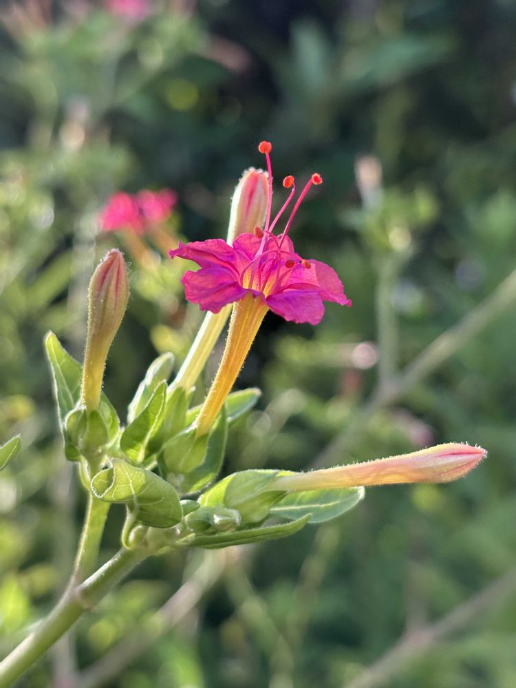 写真は、昨日の買い物帰りに見つけた白粉花(オシロイバナ)。傾いた西日に映えていました😊