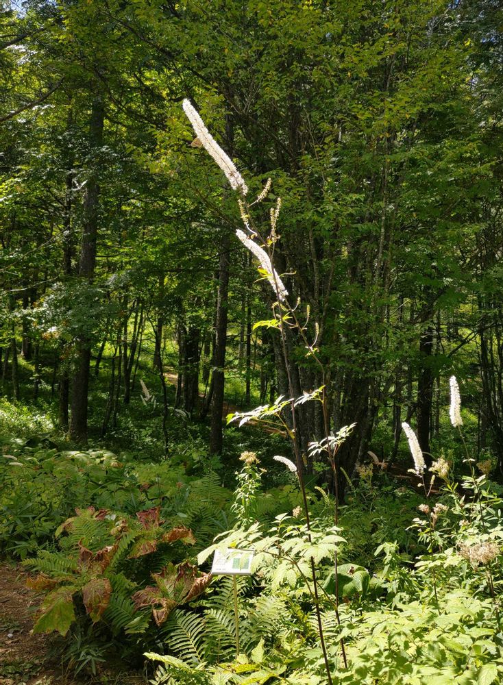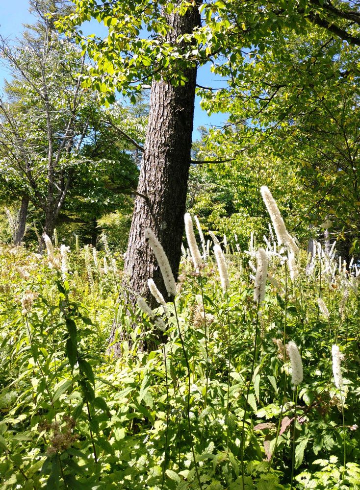 ③④⑤この季節、目を惹くのがサラシナショウマ 遠くから見るとブラシのようですが、そばで見ると白い小さな花が穂状に集まって咲いています。