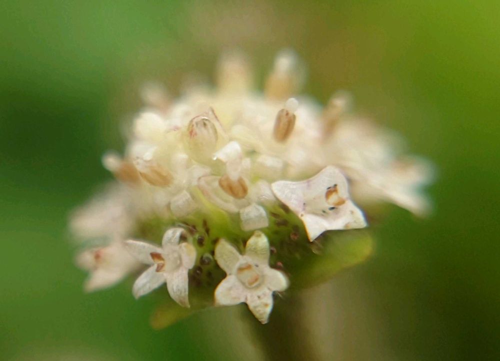 頭花は白色で、中心に不稔の両性花が固まってつき、その周囲に雌花がつく