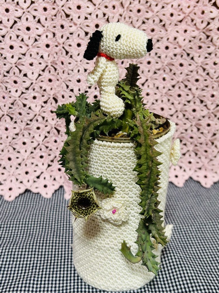 🧶ピンクのカフェカーテンをバックに🧶真っ白な可愛いスヌーピーちゃん、🧶スヌーピーちゃんとおソロの鉢カバー