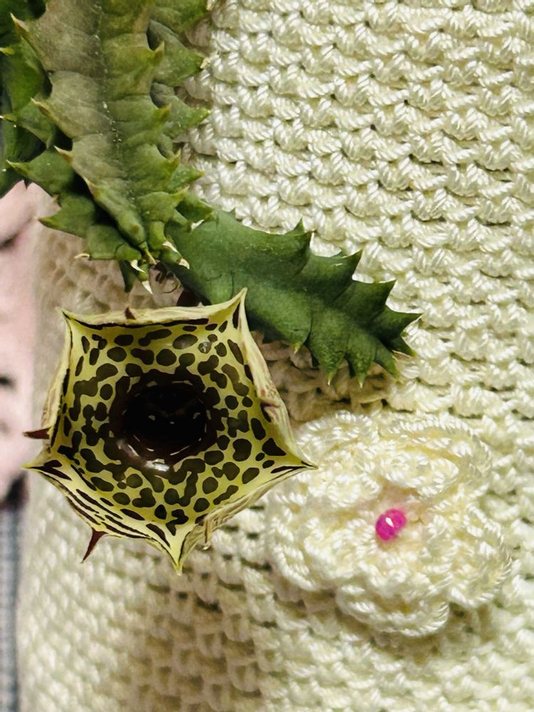 カフェカーテンと鉢カバー、鉢カバーのお花が素敵です。そしてガガ様のセントリックなお花の中の模様😍