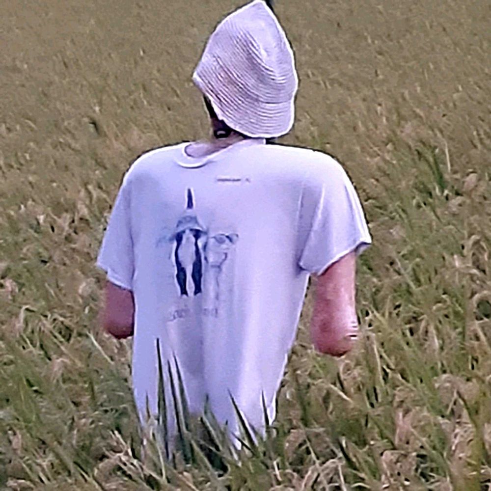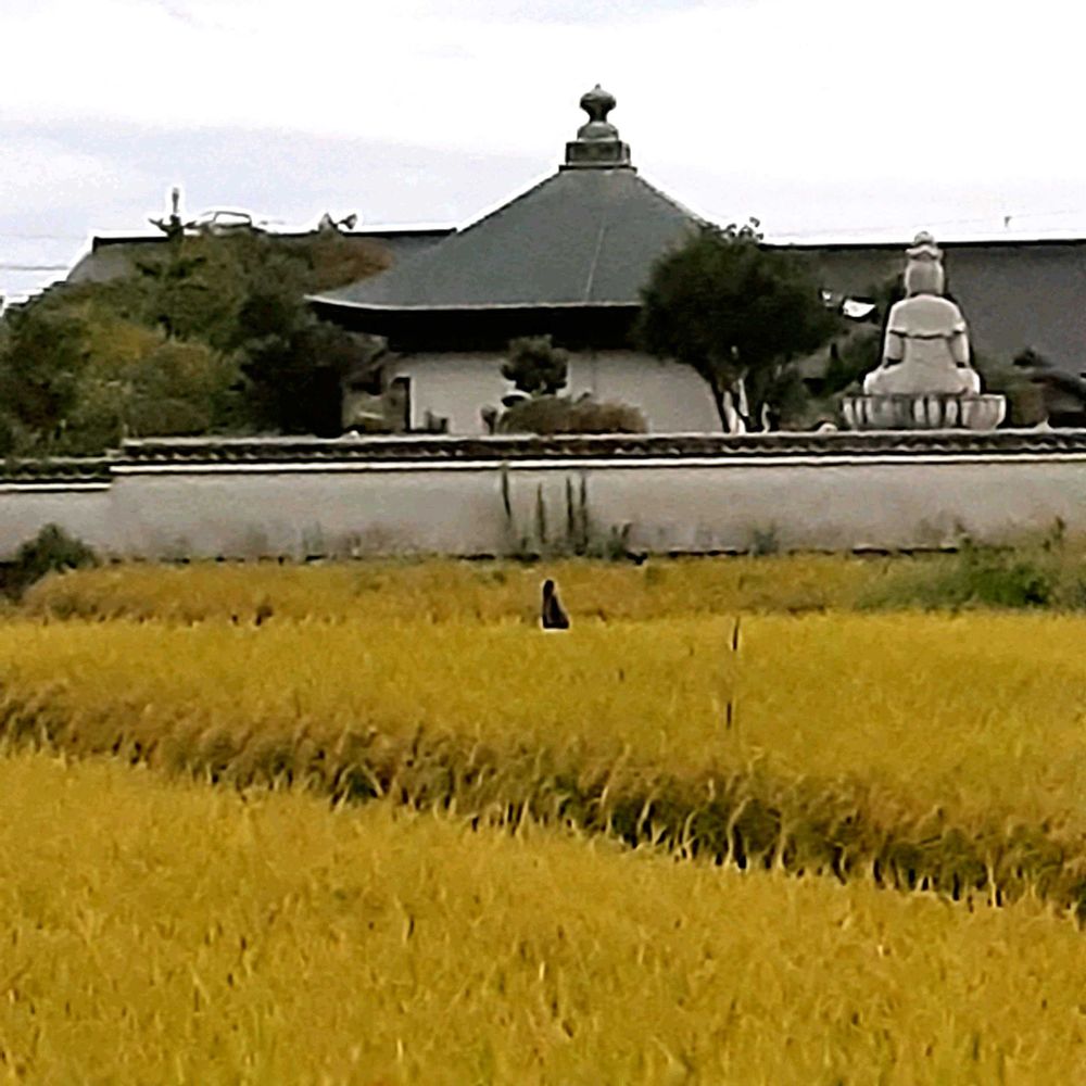 田んぼの向こうに、隣接するお寺の菩薩像の後ろ姿と屋根のてっぺんの宝珠が見えるこの景色が好きです☺️