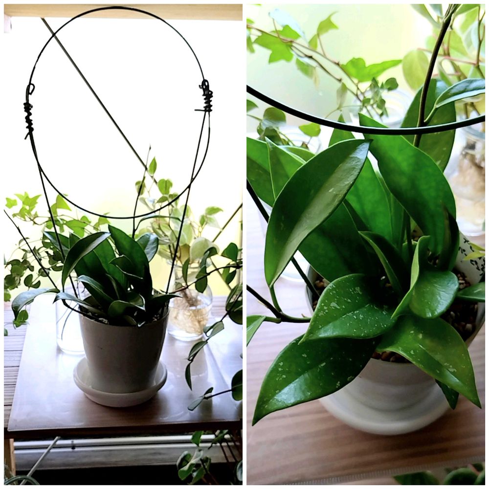 昨日の花屋でホヤみ~つけた💚でお迎えしました😊🌱とにかくツルを伸ばさないと花が咲かないホヤさん🌱もうツルが伸びてきてるので手作りの支柱をセットしてあげました😁上手く絡んでくれるかな😆🌱
