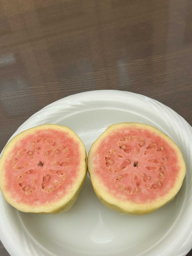 お庭にグアバ❗️素敵です。ジュースは飲んだことありますが、果実を見るのは初めて👀果肉は🩷なんですねー。