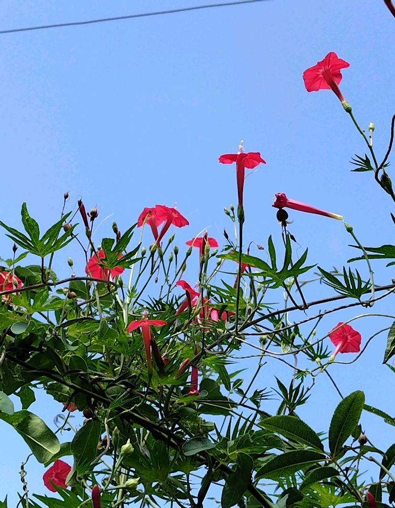 庭の足元近くにも咲いていますが、天にも昇る勢いで高い所でも青空に向かって自由奔放に咲いています❤️✨